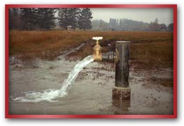 Flowing artesian wells are wells that overflow at the surface. When drilling a flowing well, it is important to control the flow. Proper construction prevents the waste of water and flooding or permanent waterlogging of the surrounding lands. We first install a larger diameter surface casing down into the clay layers and then drill the casing for the producing well inside of the surface casing. The surface casing contains any water that might be forced up, by the static water pressure, around the production well casing, so that there is no flooding of surrounding areas. |
